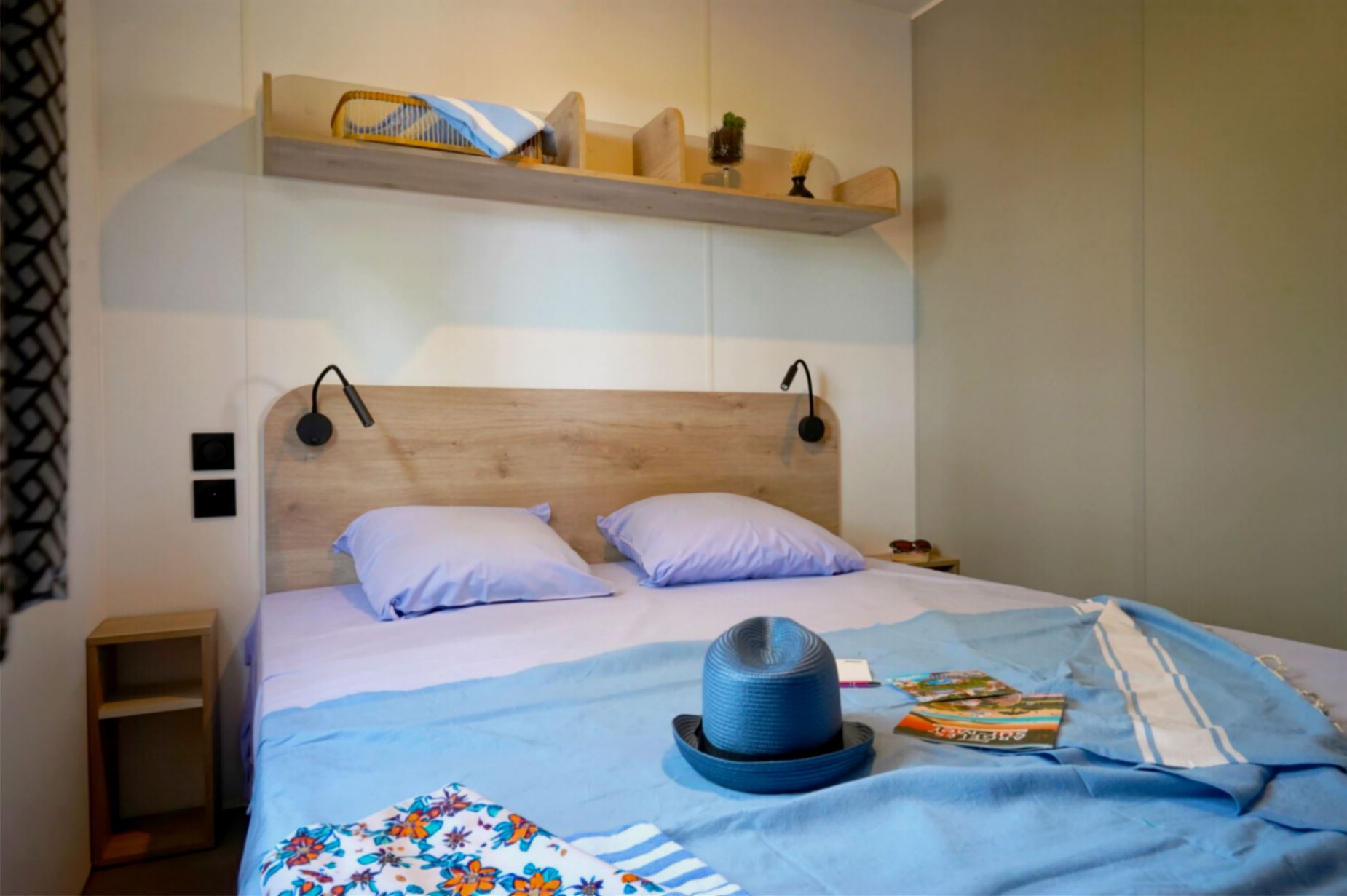 Tête de lit équipée de liseuses orientables avec interrupteur intégré