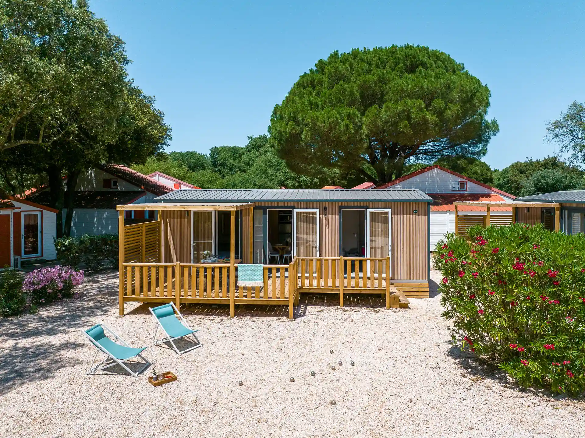 Para el alquiler de 1 habitación junto al mar, tienes a tu disposición el mobil-home Suite Duo (máx. 2 personas), que se abre a un magnífico entorno verde, donde encontrarás la tranquilidad que buscas durante una escapada romántica en un camping junto al mar Mediterráneo.